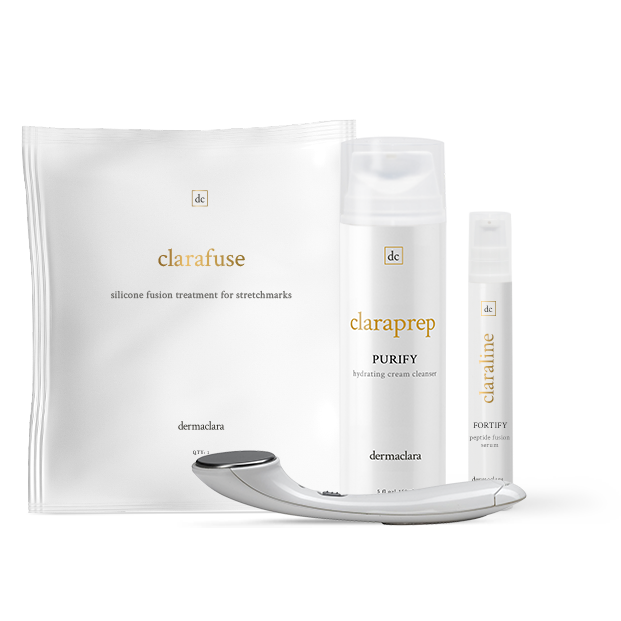 Everything you need to reduce stretch marks in one kit! Dermaclara Advanced features a complete stretch mark reduction system for the body. Cleanse, treat, and reduce stretch marks, and improve skin’s overall appearance and radiance. Includes claraprep cream cleanser, two clarafuse Silicone Fusion Treatments for the body, claraline peptide serum, and claratone micropulsation applicator.